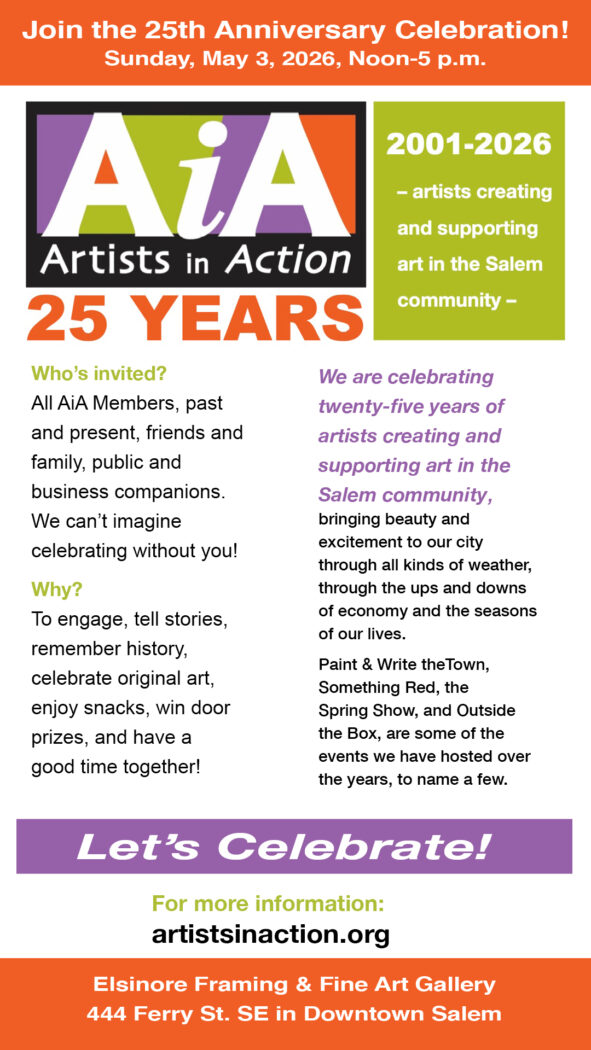 As a past or current member, past president, or board member of Artists in Action, we invite you to join us in celebrating our 25th anniversary on Sunday, May 3, from Noon to 5pm. The event will take place at Elsinore Framing/Gallery, located at 444 Ferry St. SE in downtown Salem.
